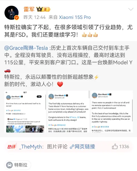 而就在幾小時后,一個意想不到的身影轉(zhuǎn)發(fā)了這條消息——小米集團(tuán)創(chuàng)始人雷軍。他鄭重寫道:“特斯拉確實了不起,在很多領(lǐng)域引領(lǐng)了行業(yè)趨勢,尤其是FSD。我們還要繼續(xù)學(xué)習(xí)!”字里行間,三個豎起的大拇指表情格外醒目。