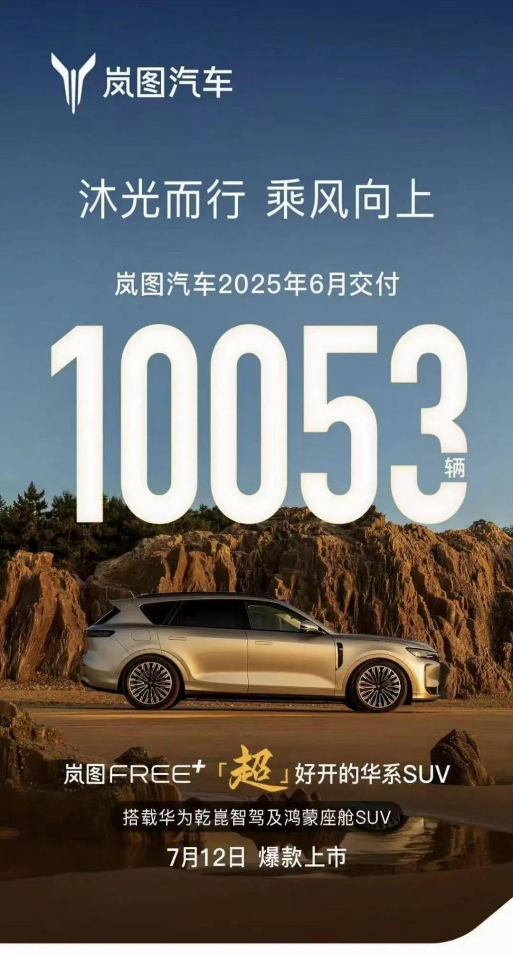 7月1日,嵐圖汽車公布了2025年6月的銷量成績,單月銷量再次實現(xiàn)破萬,達到了10053輛,今年上半年,嵐圖汽車的累計銷量達到56128輛,同比增長85%。
