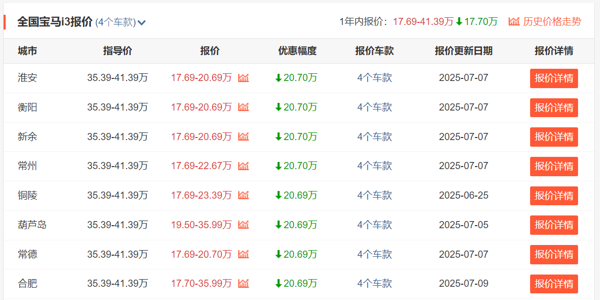 誰能想到,原價35.39-41.39萬元的寶馬i3車系,現(xiàn)如今在部分地區(qū)的終端裸車最低價格,居然已經(jīng)低至16.2萬元起了。