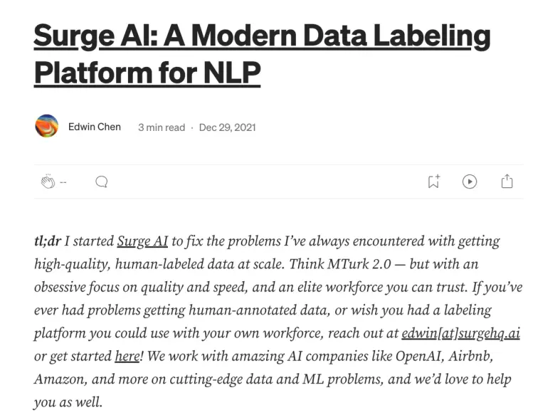 Surge AI成立,從一開始就走了高質量標注的路徑,主打質量和專家匹配,這和Scale AI主打規模和自動化的路徑非常不同。