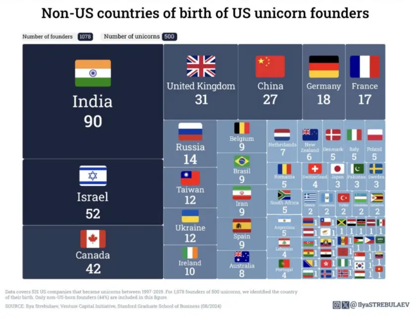 斯坦福今年的一項研究表明,美國的1078個獨角獸公司中,有44%由“美國境外出生的人”創辦,這其中,有27家創始人出生于中國(印度90家)。