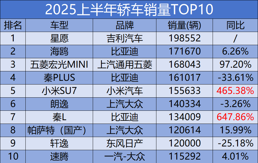上半年轎車銷量TOP10:吉利星愿奪得銷冠,秦L漲超6倍排第7?