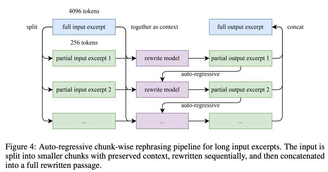 數(shù)據(jù)改寫流程,將輸入拆分為保留上下文的小塊,按順序重寫,然后拼接成完整的重寫段落。