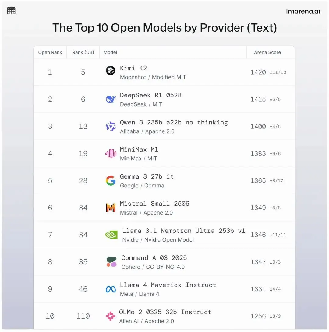 第一列是開源模型內(nèi)的排名,前四都是國(guó)產(chǎn)開源模型,Kimi K2 排在第一名;第二列是所有(開源和閉源)模型中的排名。圖片來(lái)源:https://lmarena.ai/leaderboard/text