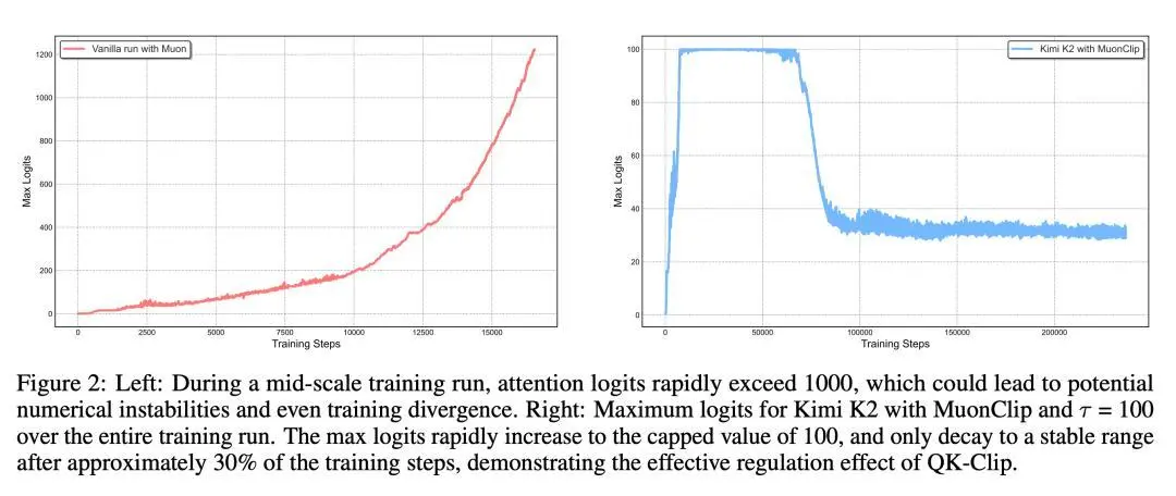 注意力權(quán)重爆炸問(wèn)題大多出現(xiàn)在超大規(guī)模的大模型訓(xùn)練中,這也是此次 Kimi K2 萬(wàn)億參數(shù)能夠成功訓(xùn)練的重要突破之一。