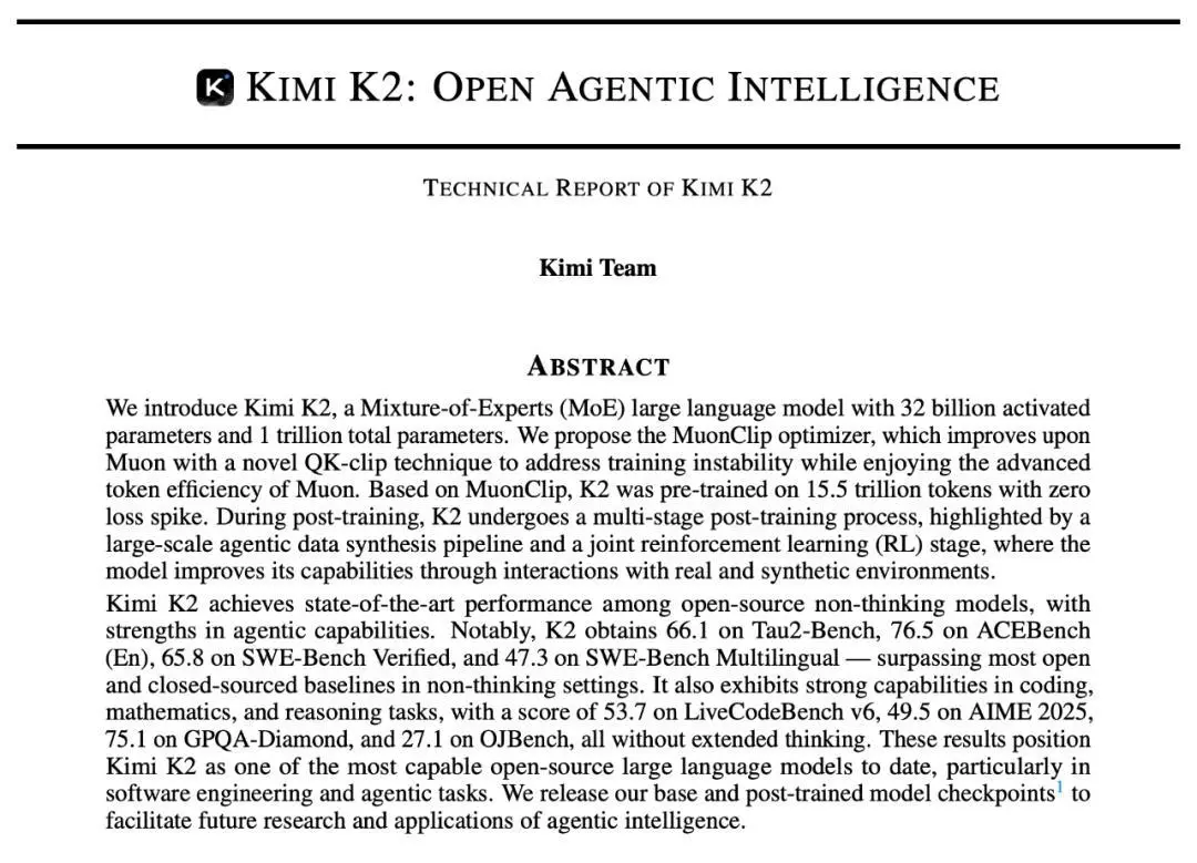 就在大家還在討論這些差異、參數(shù)規(guī)模、以及模型路線時(shí),Kimi 今天又放出了一份干貨:Kimi K2 的技術(shù)報(bào)告正式發(fā)布。