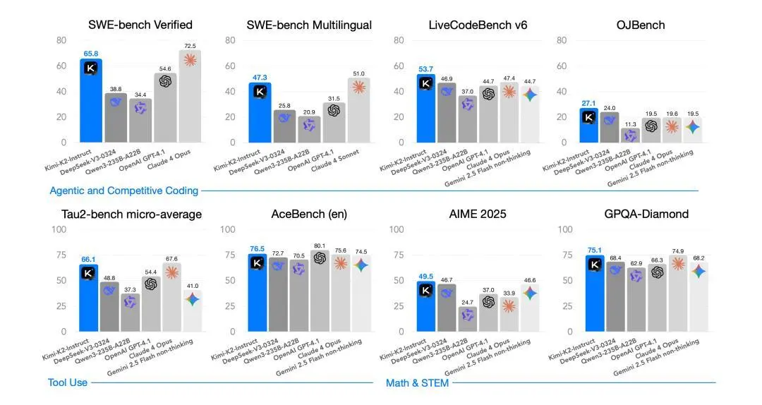 Kimi K2 在代碼、數(shù)學(xué)、工具使用和長(zhǎng)文本四項(xiàng)關(guān)鍵能力上均取得或逼近當(dāng)前開源模型的最優(yōu)成績(jī),并在多項(xiàng)任務(wù)上超越閉源標(biāo)桿。