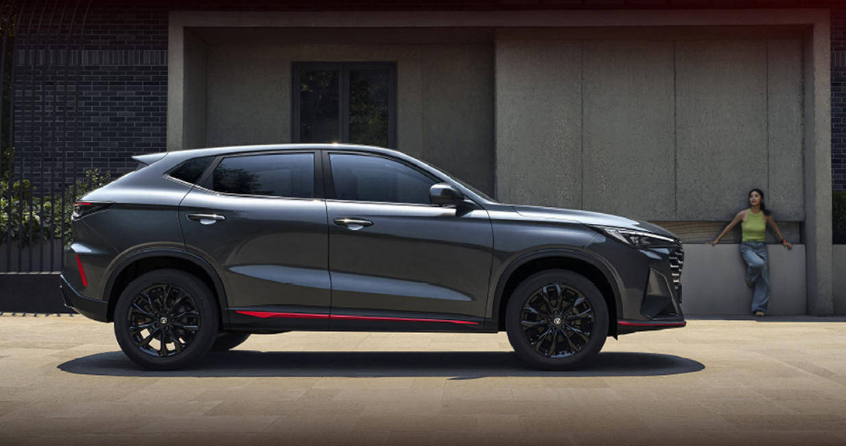 新車側面造型較為飽滿,分段式車側腰線搭配亮黑色輪眉組件運動感十足。另外,第二代長安X5 PLUS還對車窗邊框處進行熏黑處理。車尾部分,兩側造型銳利的LED尾燈組結合集成高位剎車燈的車頂擾流板組件和寬大的熏黑后包圍層次感、辨識度較強。尺寸方面,新車長寬高分別為4540/1860/1590(1620)mm,軸距為2715mm。