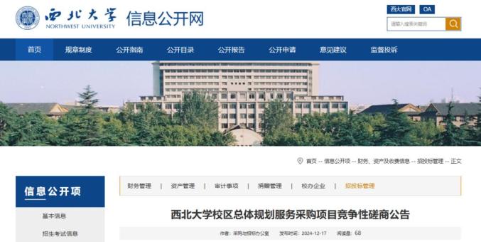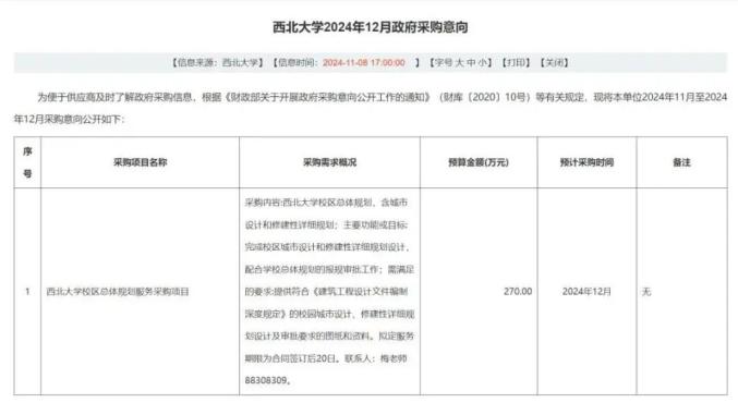 11月8日,西北大學發布采購意向,計劃在12月進行《西北大學校區總體規劃》的采購,進行西北大學校區總體規劃的編制,完成校區城市設計和修建性詳細規劃設計。