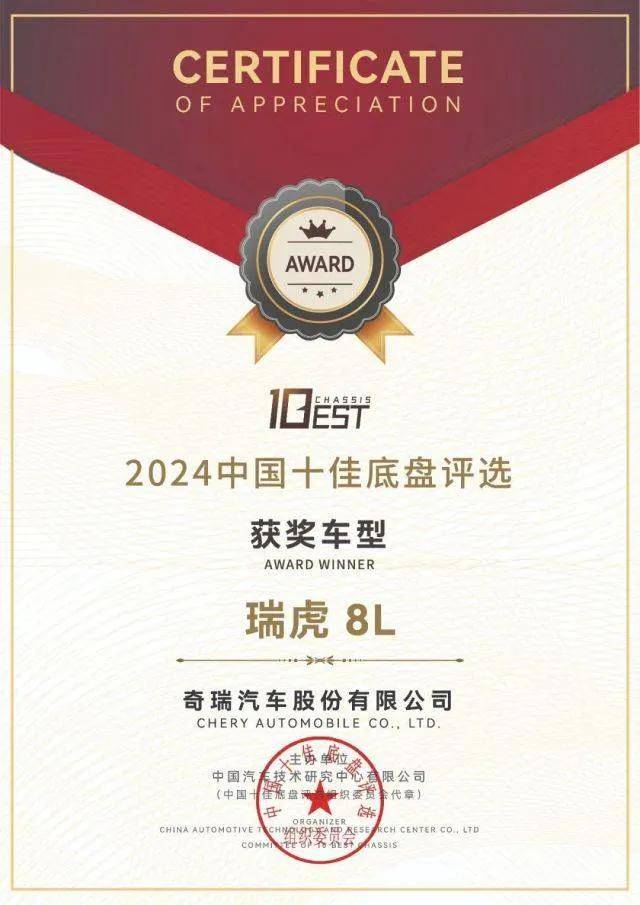2024年8月推出的瑞虎8L,榮獲2024中國十佳底盤和十佳車身稱號,作為唯一一款進入該榜單的燃油車型,展現了瑞虎系列在中國品牌燃油SUV技術領域的領先地位。