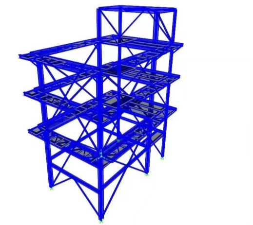 脫硝反應器本體是采用多層框架結構。自底層開始每層布置催化劑24塊擱置于框架梁上,共布置三層。框架頂層布置整流格柵,用于調整煙氣流速、氨氣摩爾比以及混合氣體入射方向。每層框架梁在面內通過鋼管加勁增加面內整體剛度,層與層之間則通過立柱增加整體剛度,同時層間設置角鋼對反應器殼體起到約束作用。反應器本體通過底層的5根框架梁(共10個支座) 擱置于反應器支架上。
