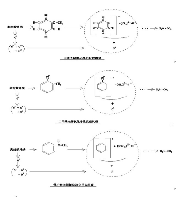 研究表明:活性自由基·OH 的氧化電位(2.8eV)比氧化性_的臭氧的氧化電位(2.07eV)還高出35%。·OH 自由基與有機物的反應速度高出幾個數量級。而且·OH自由基對氧化污染物的反應是無選擇性的,可引發鏈式反應,直接將污染空氣中的大部分有害物質氧化為二氧化碳和水或礦物質。其作用機理如下: