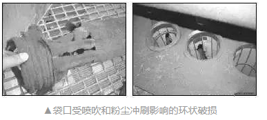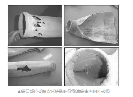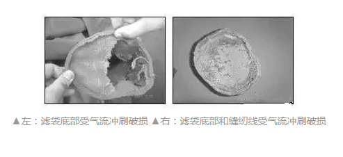 濾袋袋口部位破損多在袋口向下30-40公分以內,多表現為濾料底層吹破、脫落。多為壓縮空氣過高、噴吹管歪斜、花板變形等原因造成,在安裝過程中要注意安裝的質量。